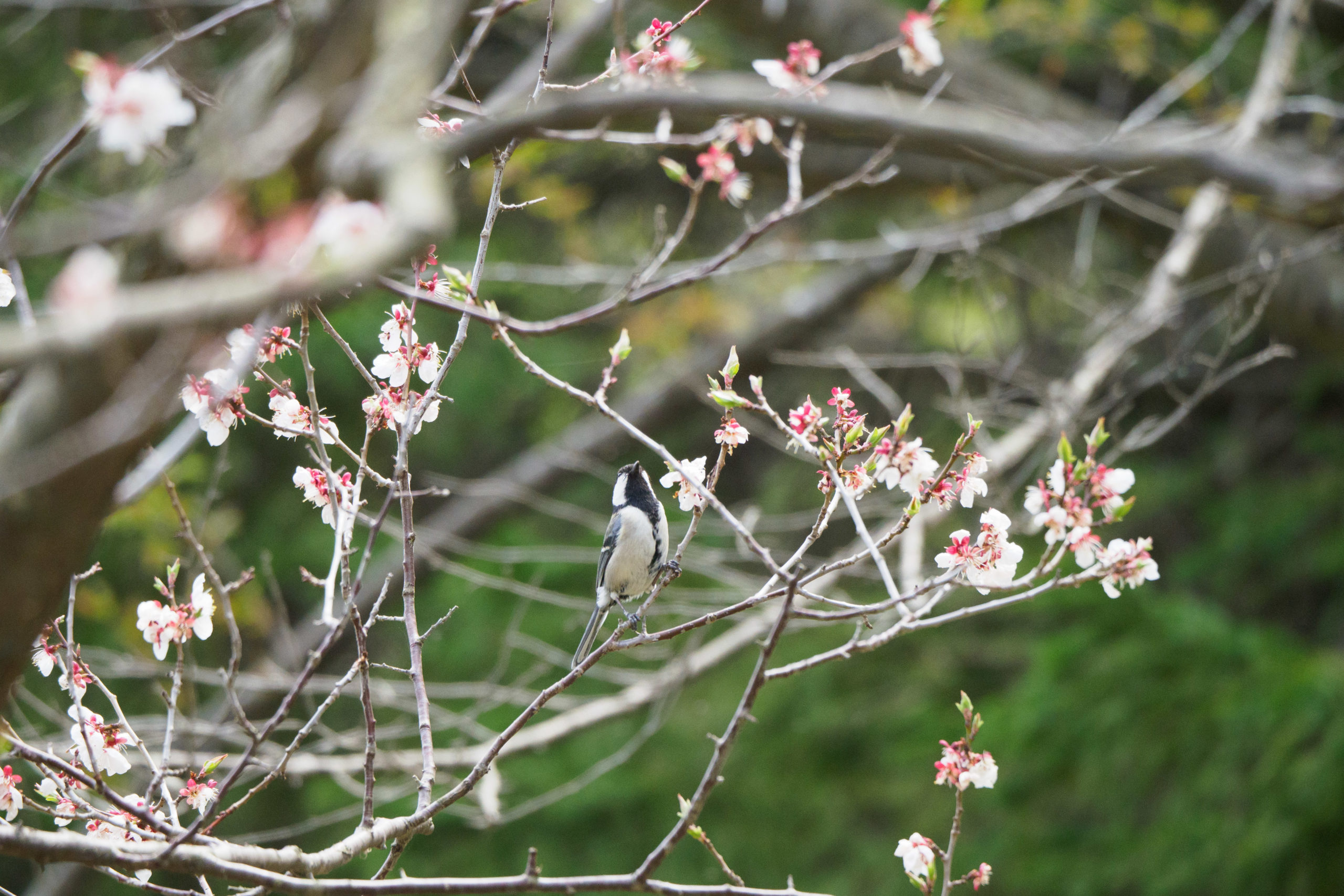 本州では梅にはメジロですが北海道ではシジュウカラ