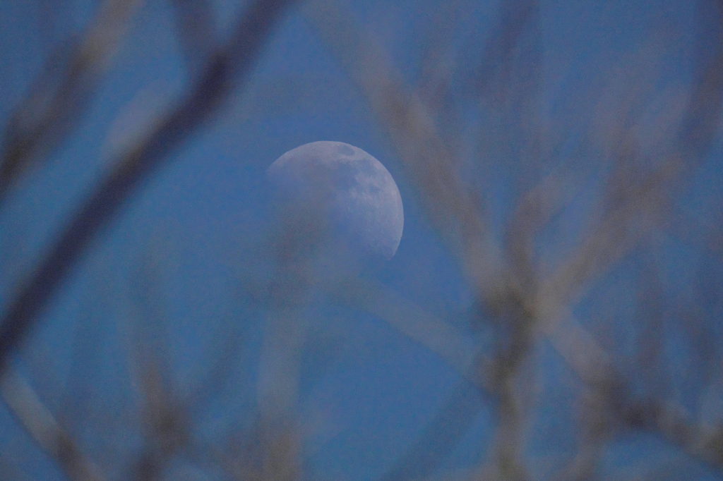 先日、公園へ散歩にでかけた折、まだ日が高い時刻ながら、月が残ってたので試し撮りしてみました。